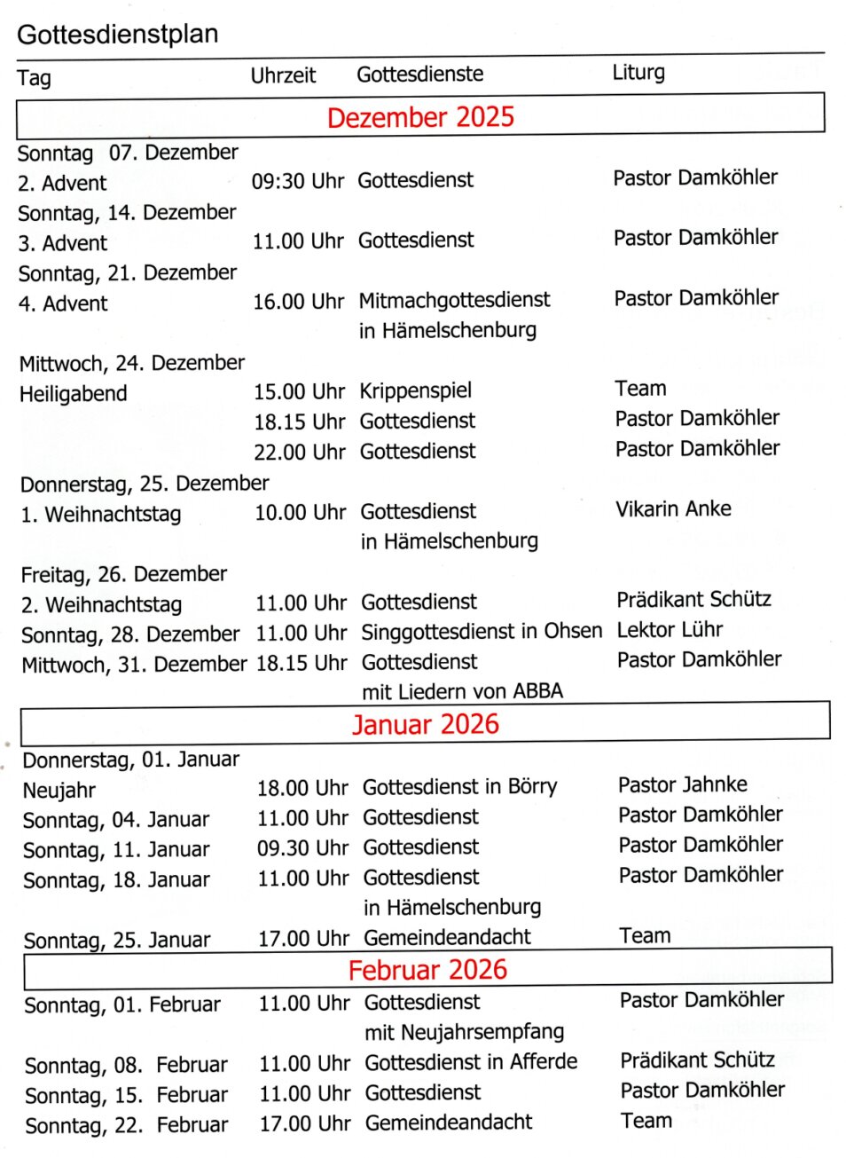 Gottesdienstplan von Dezember bis Februar 2026 - KG Tündern